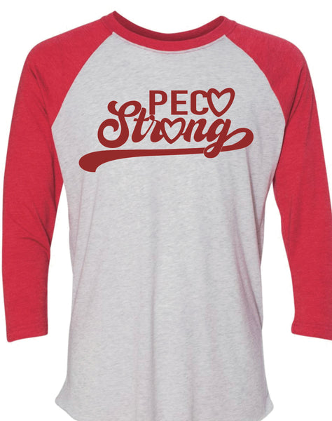 Show your PeCo pride and support a great cause with this stylish Next Level 3/4 Sleeve Raglan Tee! Featuring a bold PECO STRONG design, this red and white heathered shirt is perfect for staying comfy and looking sharp while making a difference.